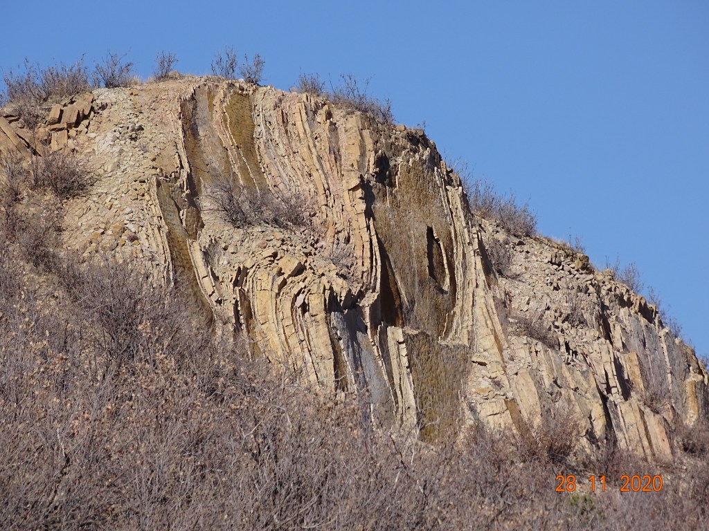 For those not tuned in to Southwest Geology, a sill is an igneous intrusive that has inserted itself parallel to the surrounding strata (a dike runs at angles to the strata). Palisade Sill is a huge intrusive in northern New Mexico between Raton and Taos on Highway 64. You won’t miss it when you head west into the canyon out of Cimarron. The sill is made of Monzonite, which is on the continuum between syenite (very light in color) and diorite (medium in color) and has plagioclase and orthoclase feldspars in approximately equal amounts. In short, it is a lighter than granite, but generally similar.