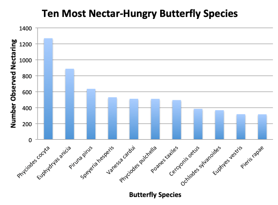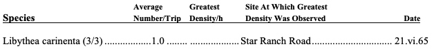 The “average number per trip” is calculated as the total number of individuals observed divided by the number of trips afield during which the species was encountered. Thus, if I found a total of 320 individuals of a species on 70 trips afield, the average density would be recorded as 320/70 = 4.6 / trip (not per hour). The “maximum density” is derived from the single trip afield during which the observed number of individuals of a species divided by the time afield equals the largest quotient. For example, if a three-hour trip found 29 individuals, the recorded density would be 29/3 = 9.7/hour. If on another trip, two and a half hours turned up 27 individuals, then 27/2.5 = 10.8/hour, a greater observed density. Thus, the greatest density observed is reported. “TNTC” means too numerous to count, usually reflecting population explosions.