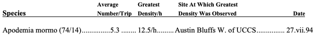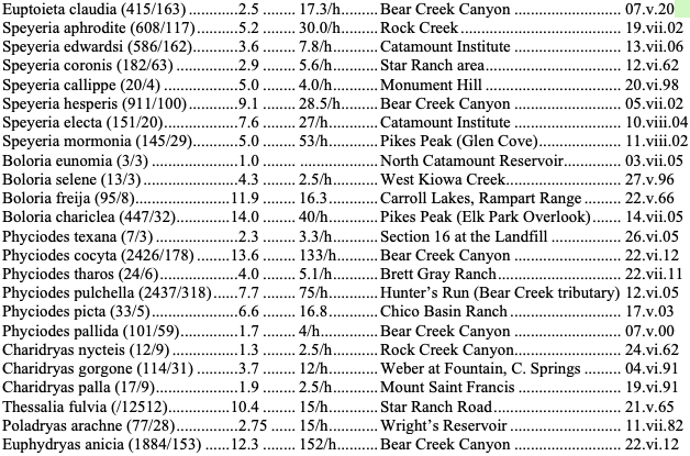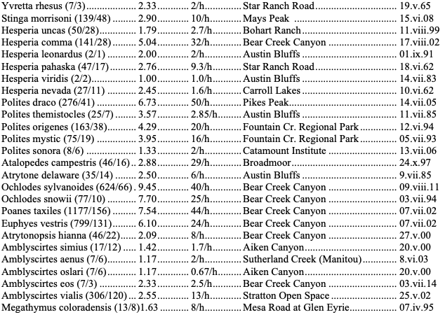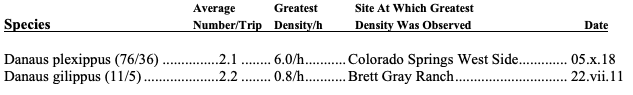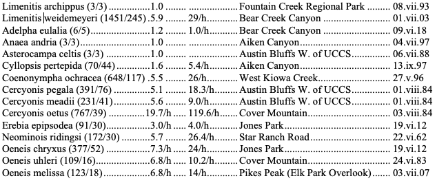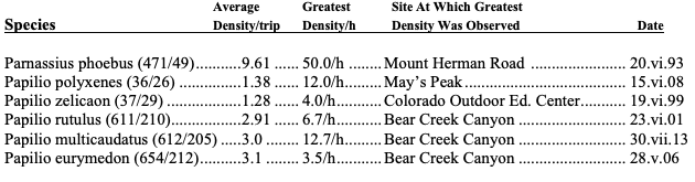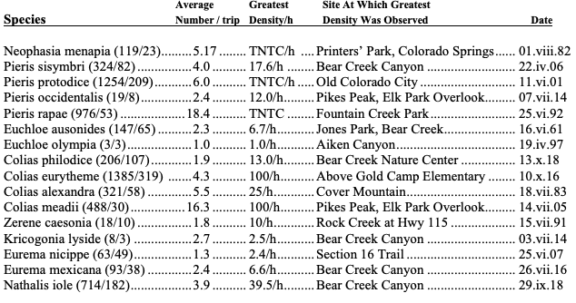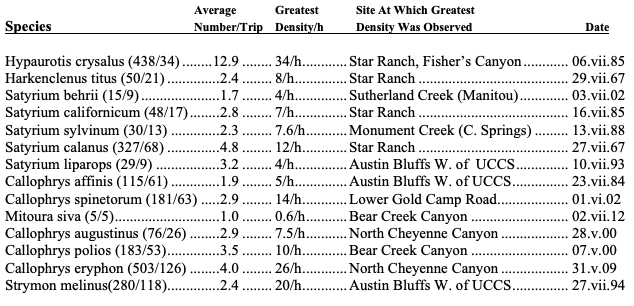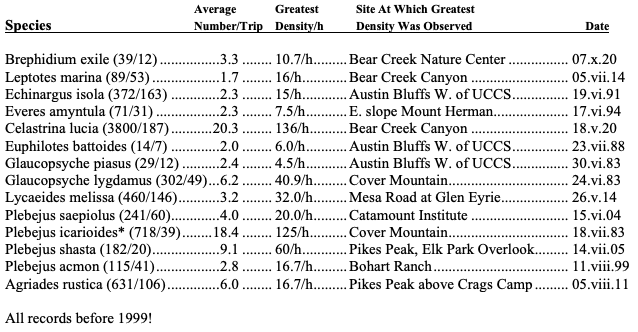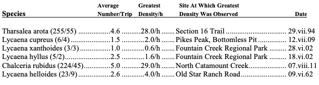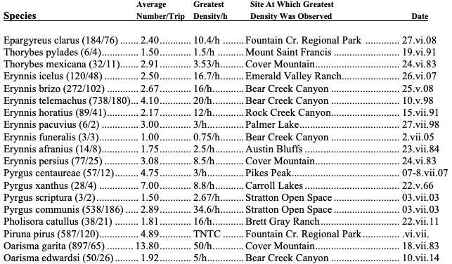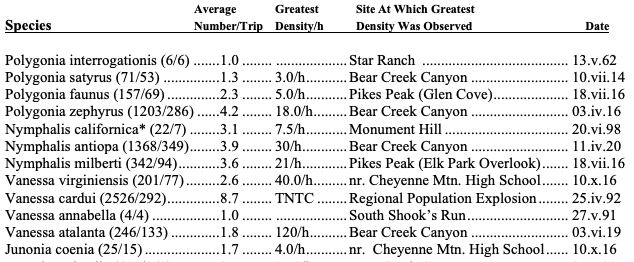 The following records, drawn from my field logs of the last 59 years, sift out the average and the greatest observed densities of many of the common butterflies in the Pikes Peak Region. This work has been done so that future workers in this field can compare observations to see if populations are becoming more or less dense with time.