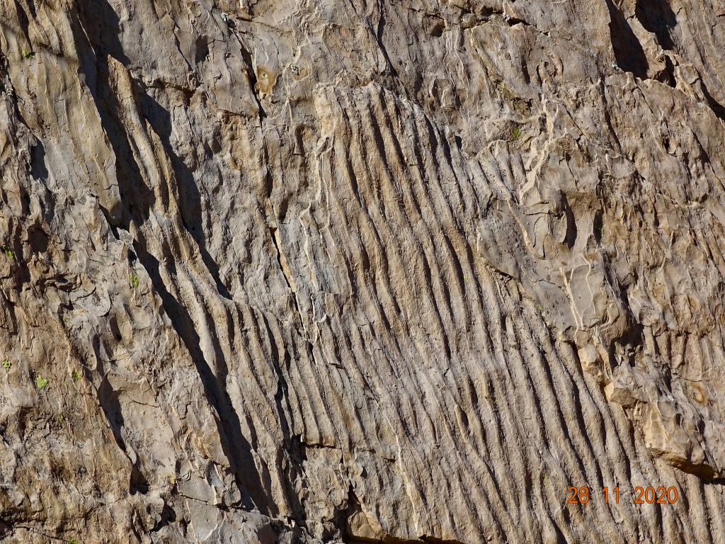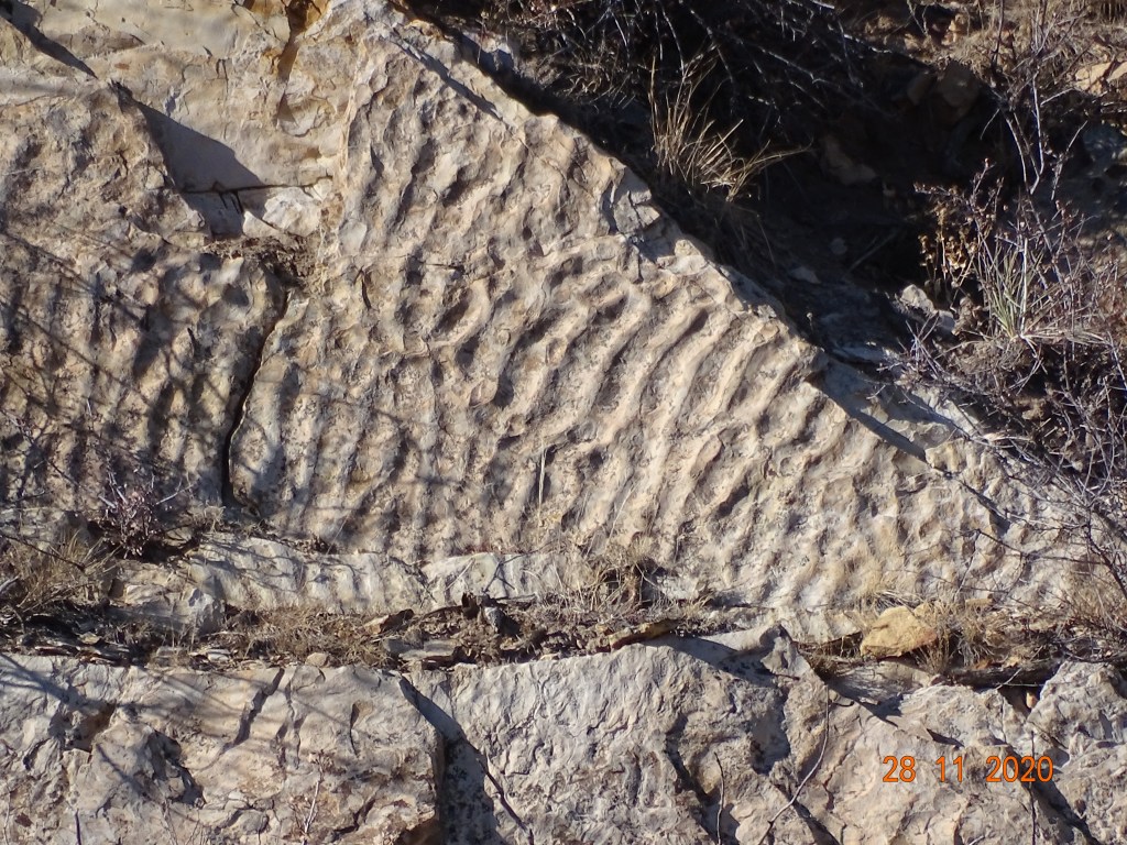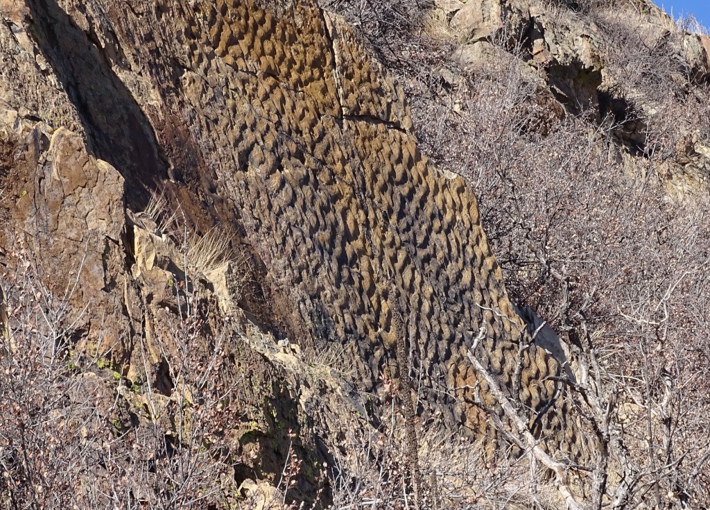 Hiking the extensive trail system that connects Red Rocks Park with Section 16, west of Colorado Springs, one encounters an impressive array of ripple-marked sandstones, a beach back in the Mesozoic, now dipping at almost 90°. The so-called “White Acres Trail” should have been named “Ripple Mark Trail.” The steep east-facing slope of the hogback seems to be Niabrara sandstone, but is backed on the west by Dakota SS, both of which form hogbacks. But how about these classic ripple marks?