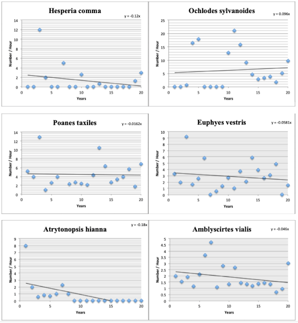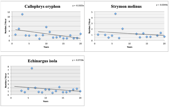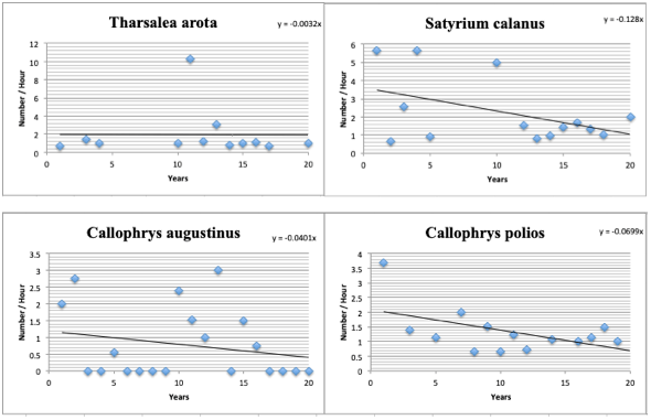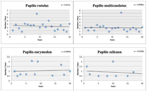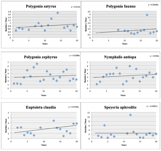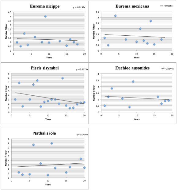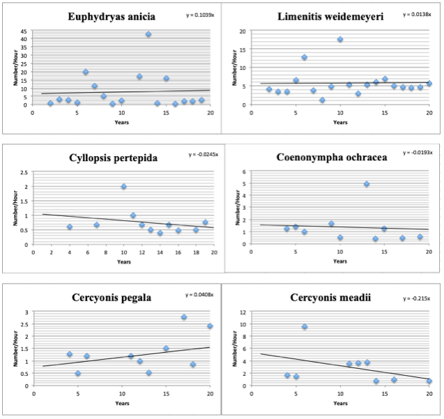 Butterfly abundances are recorded in terms of numbers observed per hour, and the average for each year is recorded for graphing purposes. Thus, the graphs show the annual average abundances as a function of years. Slopes are plotted for each data set, and although none of the effects approach linear, the slopes are shown to address the general trends across the years. The broad scatter is due to many factors, including climatic and weather conditions, experimental error, and the natural fluctuations of populations.