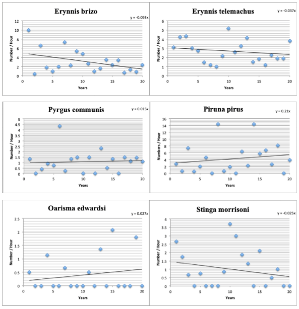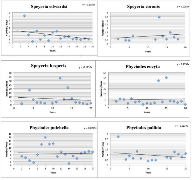Forty-six species were chosen from the 125 that have been found at the site. These species are generally widespread, found almost every year, and do not tend to produce population explosions. Formerly rare species such as Amblyscirtes eos, Brephidium exile, Junonia coenia, and Adelpha eulalia were excluded because they are moving into the region in numbers as of the last five to seven years. These, of course, show increasing numbers.